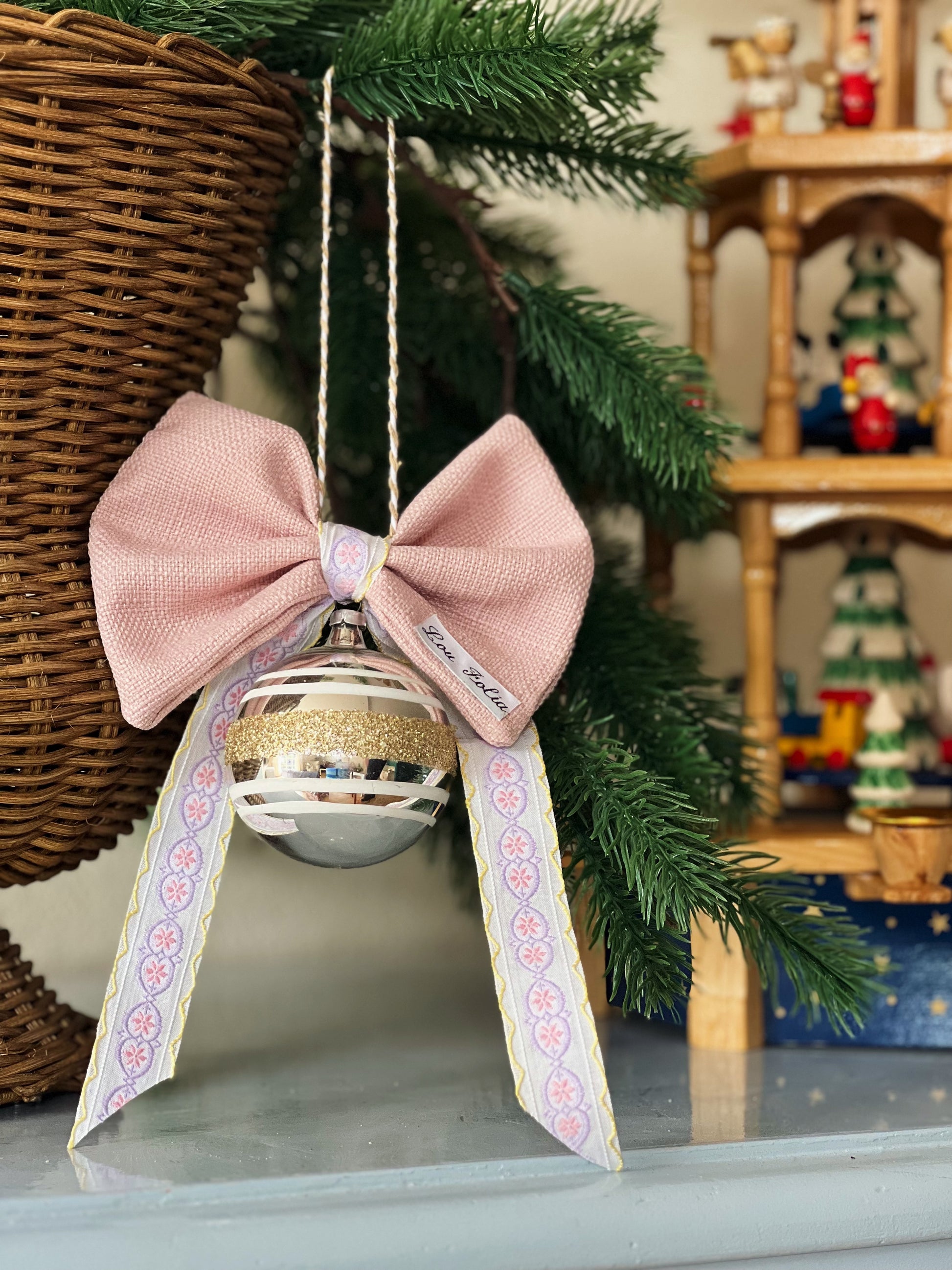 Hver sløjfe er lavet i hånden af nøje udvalgte tekstiler og bånd. Vintage julekuglerne er alle lavet af glas og bærer præg af deres alder, men på smuk vis. Vælg netop den julekugle med sløjfe, som vil tilføje et strejf af ekstra personlighed til din jul.
