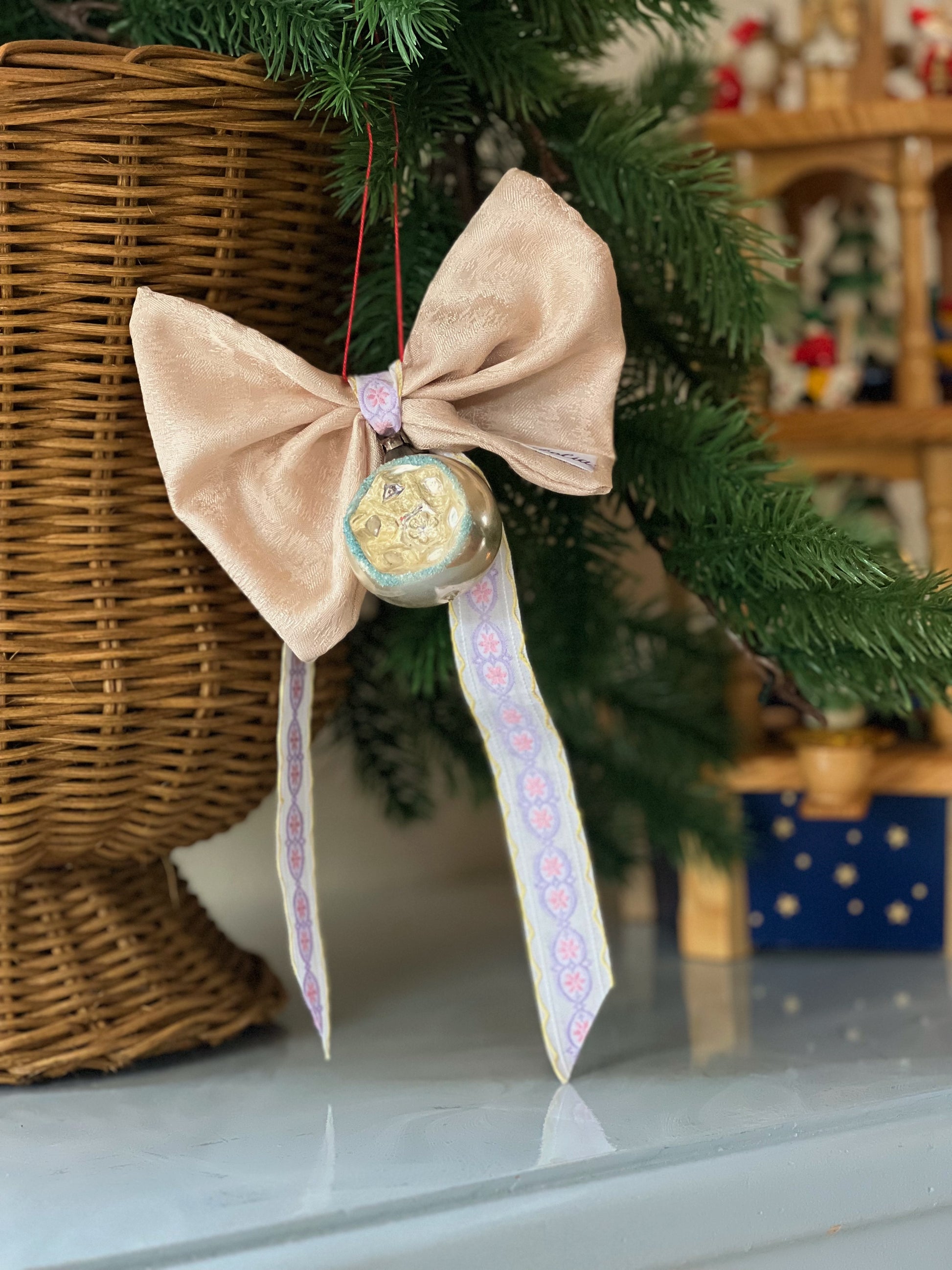 Hver sløjfe er lavet i hånden af nøje udvalgte tekstiler og bånd. Vintage julekuglerne er alle lavet af glas og bærer præg af deres alder, men på smuk vis. Vælg netop den julekugle med sløjfe, som vil tilføje et strejf af ekstra personlighed til din jul.