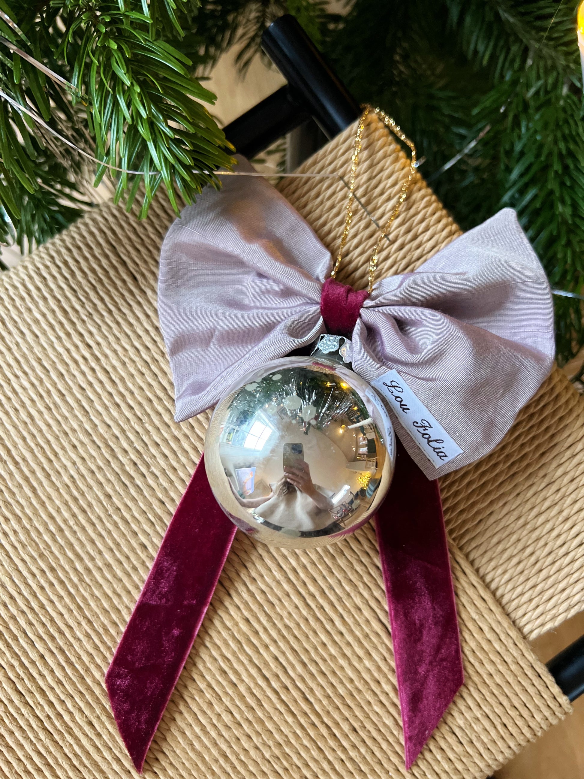 Hver sløjfe er lavet i hånden af nøje udvalgte tekstiler og bånd. Vintage julekuglerne er alle lavet af glas og bærer præg af deres alder, men på smuk vis. Vælg netop den julekugle med sløjfe, som vil tilføje et strejf af ekstra personlighed til din jul.